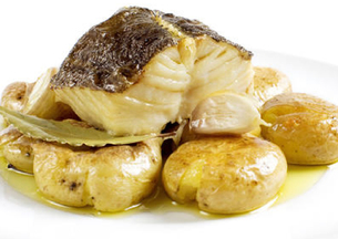 • Lombo de Bacalhau confitado com Broa no Forno, acompanhado de batata à murro